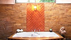In addition to a shower, the bathrooms feauture a large jacuzzi, next to which an exotic Cambodian statue of a couple embracing suggests that the occupants of the jacuzzi do the same.