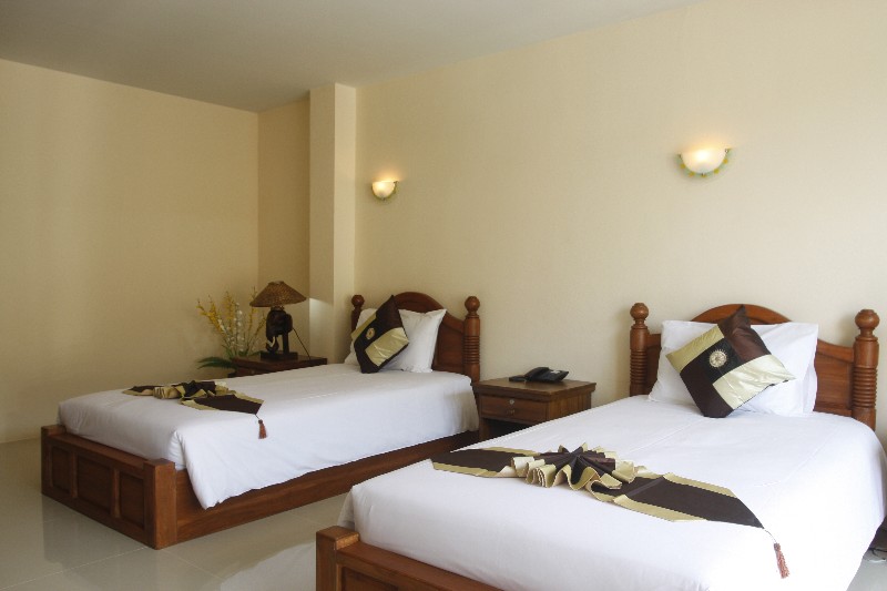 As is the case with its neighboring hotel the Pranang Flora House, the rooms to the front of the hotels have a great view of the karst buttresses that separate Railay from Ao Nang, but are a little bit noisy, so if you are unaccustomed to any traffic noise when you sleep, probably not a good choice. The rooms at the back are quiet, but have no view. All have air/con.