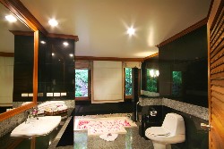 The spacious and lavishly decorated bathrooms feature a large hot tub.