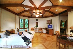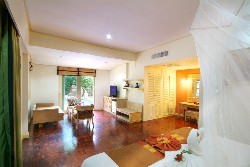 These huge and classy suites have gleaming hardwood floors and are tastefully decorated and furnished. They are spotlessly clean, but not in 100% mint condition, as the baths need replacing and some of the wallpaper is in less than perfect condition. Many people will feel that these' suites great location and facilities make up for their slightly worn condition. If you need a large 4 star family suite, Ao Nang has no better option than these units, your best other bet is to rent a villa, maybe this one.