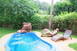 The suites' terraces are relaxing places for parents, who can keep half an eye on their children in the pool, while relaxing with a book on the comfortable and shady terrace. Actually, each unit has 3 terraces, two equipped with a pair of loungers and one equipped with a table and chairs. The terraces are set in a shady, fairly private and lushly planted corner of the resort, and are close to a poolside massage sala. For many families, this equation holds true: