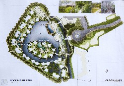 Particularly tall travellers must duck beneath the arch of reeds which rises from either side of the bridge, forming a canopied tunnel festooned with tiny purple flowers. This use of running water for architectural purposes, which continues throughout the Peace Laguna resort, is restfull on the senses.