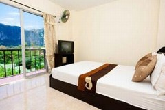 The rooms at the front suffer from a little traffic noise, but those at the back do not. The top (3rd) floor room at the back has a sensational panoramic view of the karst ramparts that separate Ao Nang from Railay and, for those who can be bothered to climb the stairs, is an excellent choice. The sunset view is one of the best in Ao Nang, with the minarets of Ao Nang's newest mosque gracefully piercing a blazing sky - it's really something.