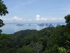 | From the top there are panoramic views over Ao Nang, Krabi, Koh Hong Archipelago, Phang Nga bay and Railay/Tonsai. It is a steep two and a half hour climb (no ropes needed) to the top. Most trekkers will detour to the waterfall on the way down for a cool shower - the waterfall dries up to a small stream in the high season, but always offers the trekker a very welcome cool shower. |