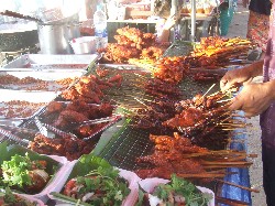 The nearest chicken sticks to the camera are of barbequed chicken covered in sweet chili paste. The vendor is holding sticks of chicken offal, which are not as much to the taste of most Westerners as are the chicken wings in front of them, which sell for THB 10 each. |