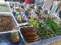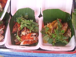 The chicken and duck are basted with a little garlic and pepper during roasting, and are a favourite with Westerners, particularly children. Expect to pay about THB 80 for half a chicken and THB 100 for half a duck. |