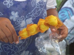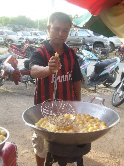 There are usually a stall or two selling deep-fried pork and fish sticks, and often at such places you will see the strange-looking sticks in the image as well. They are deep-fried battered quail eggs, and are absolutely delicious when served with sweet chili sauce. They cost THB 10 per stick. |