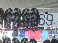If, like the author, THB 69 for a pair of flip-flops busts your footwear budget, then head off to Bangkok’s Chatuchak market, where you can pick up a dozen pairs for THB 35 a pair. Here in Krabi Town tbhey go for about THB 100, less than half the price in the expensive beachfront shops in Ao Nang. |