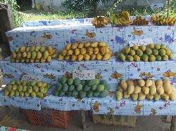 The image shows six different types of mango. The yellow ones are ripe, soft and sweet, whilst the green fruit are unripe and hard. The greens mangoes are also very sour - popular mainly with Thai women, they are eaten with shrimp paste flavoured with sugar and chili. The half-green, half-yellow mangoes are a little sour. Most Westerners will only enjoy the sweet, soft, ripe, yellow mangoes. Expect to pay no more than THB 40 for a kilo of top-quality fruit. |