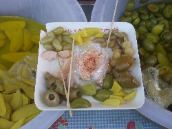 Normally made from unripe, sour fruit, these pickled fruit are eaten with a sugar, chili and salt dip, as shown in the image. |
