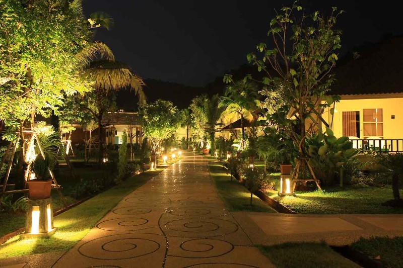 The impressive grounds, which are not over-densely populated with accommodation units, are particularly atmospheric when the manicured foliage is softly lit by a myriad of small lamps illuminating the trees and shrubbery from behind.