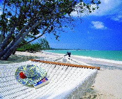 The resort offers complimentary kayaking and sailing. The wide sandy beach and the restaurant fronting it are approached by crossing a wooden bridge over a lilly- and reed-filled waterway. |
