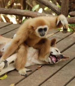 After sleeping like a baby, rocked by the gentle swells of the lake on which your bungalow floats, you awaken to the territorial cries of gibbons in the canopy above (unlike the one in this image, who is pals with one of Khao Sok's daftest dogs and prefers sleeping indoors these days).