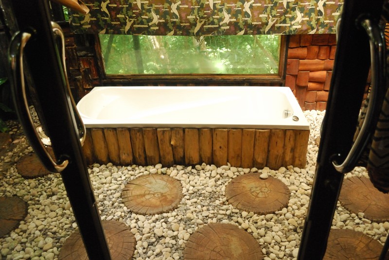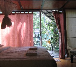 In addition to air-con, a DVD player, a computer, a private jungle-viewing terrace and a lovely bathroom whose floor is covered in sea-smoothed pebbles, it has 2 bedrooms, so ensuring parents night-time privacy.
