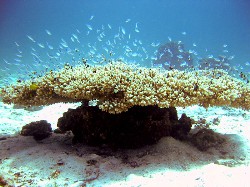 | The sponge corals are particularly impressive here (see the image on the right), the brain corals are huge and finely wrought (see the above image), the mountain corals look like massive melting blocks of iridescent marshmallow, and the table corals are big enough for a small tribe to set place-mats at (see image below). |