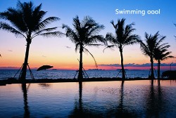 The layout follows the classicv Thai pattern, with a central garden and pool area next to the beach, flanked by a row of bungalows on each side, and backed by a building full of hotel rooms.