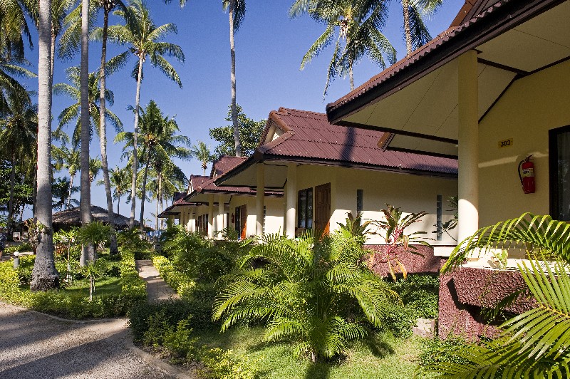 The bungalows’ balconies are on the small side, but are perfectly adequate for a shorter stay. They have air-con, attractive views of mature palm trees and are only a few metres from the beach.