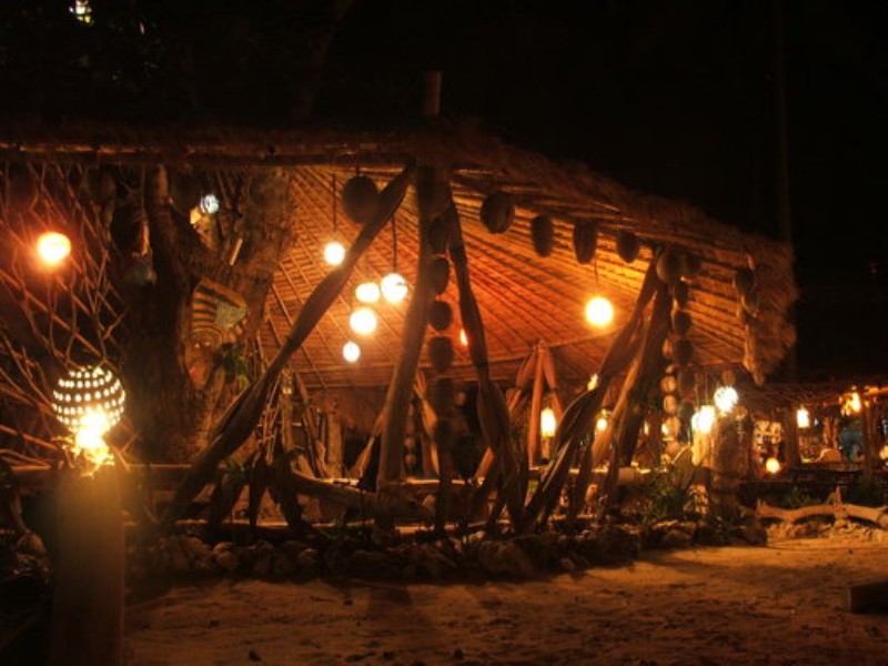 | All the resort’s roofs are thatched and the only concrete on display is on the lobby floor. A large and charming boat-shaped communal dining table, complete with comfy back-rests, is a great place to socialize and meet other travelers, and is beautifully decorated with strings of hanging coconuts and washed-up coral. |