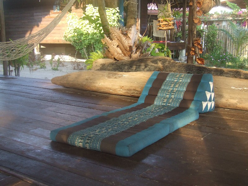 The visitor is spoiled for choice for comfy places to collapse – hammocks, Thai cushions, bamboo benches with comfy cushion backs, driftwood backed by comfy cushions – it’s quite a job figuring out which spot you fancy most.