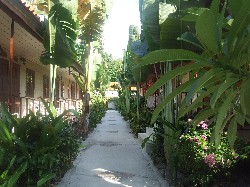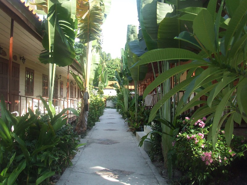 The pathways between the bungalows are attractively ensconced but not enveloped by lush vegetation.