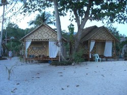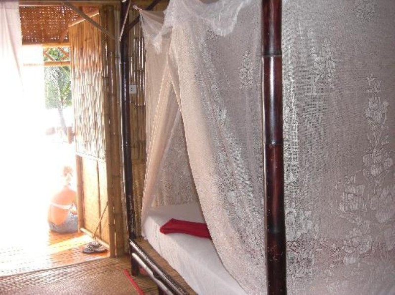 | The huts are almost new, spotlessly clean and are made completely from bamboo. There is a semi-outdoor bathroom at the back. The beds are comfortable and are encased in huge, clean mosquito nets. Each hut has a fan and there is also a nice little sitting area at the front. |