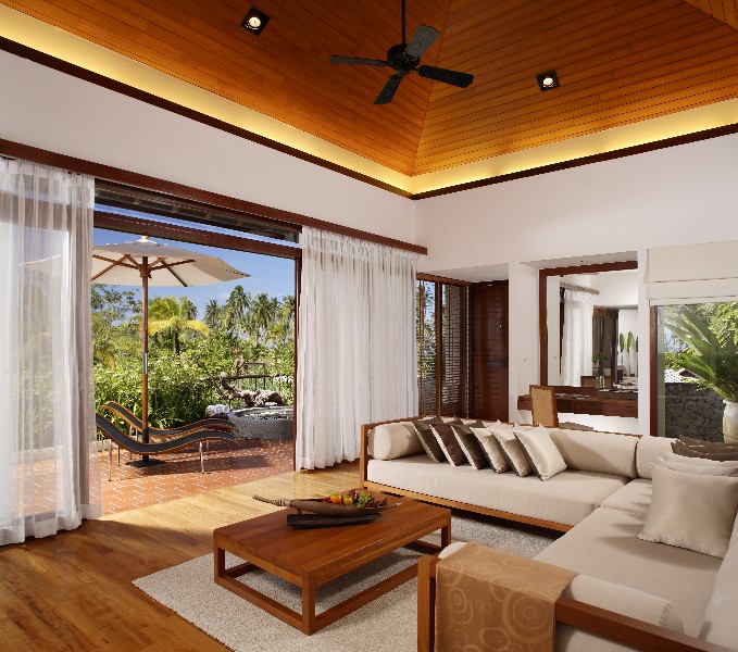 These 28 villas are the same as the ‘Pool Residences’, except that the sala is not enclosed in a private garden, and there is no plunge pool. Whilst these villas do not offer the total privacy of the ‘Pool Residences’, they are still very private, due to the low density of accommodation in the resort and to the fact that their entrances are screened by foliage. |