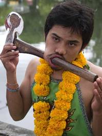 Having your photo taken with a cute gibbon on one of the beaches is very dangerous, not to you but to the species. During Phuket’s Vegetarian Festival celebrants go into hypnotic trances and become mediums for spirits from beyond the grave, who instruct them to pierce their bodies with all manner of household objects, Kalashnikov rifle barrels, and very large knives. If you think that you too will feel no pain with a light-bulb sticking out of your tongue or a sword out of your cheek, then by all means join in, but maybe ask your insurance company for their approval first.