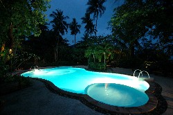 The end effect is really very impressive, an elegant understatement of class and taste. The visitor approaches his villa along charming jungle paths, above which coconut trees sway and squirrels hop from branch to branch in the lesser trees. This jungle setting surrounds most of the villas, most of which are cocooned in an atmospheric and private jungle setting.