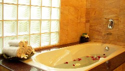 In addition to a shower, the bathrooms feauture a large jacuzzi, next to which an exotic Cambodian statue of a couple embracing suggests that the occupants of the jacuzzi do the same.