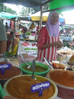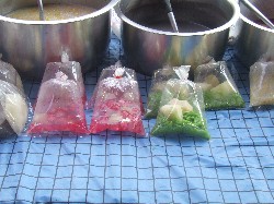 A portion of curry sells for THB 30 and is sold in a plastic bag sealed with an elastic band. Rice or noodles cost THB 10 per portion extra. If you want a dish that is not spicy, ask for one that is ‘mai pet’. |