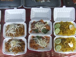 Either chicken and yellow rice, or noodles and beansprouts, cost only THB 20 per serving. |