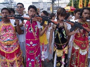 It’s October 19th 2013, and Phuket’s Vegetarian Festival is in full swing. Drink lots of soya milk before you go to this festival, as this will hopefully keep your stomach settled. Your tummy will need all the help it can get, but not because of the food you’ll be eating. The vegetarian festival has morphed into something very different from its lentil-munching beginnings, and has now become a day-long extreme body-piercing event. And when I say extreme I mean extreme.