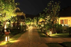 The impressive grounds, which are not over-densely populated with accommodation units, are particularly atmospheric when the manicured foliage is softly lit by a myriad of small lamps illuminating the trees and shrubbery from behind.