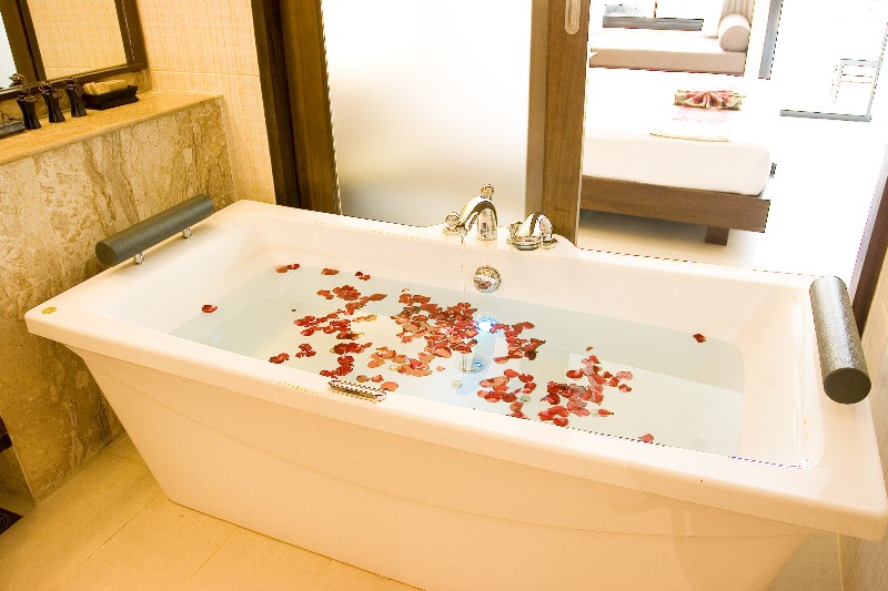 The luxurious and over-sized bathtub not only has Jacuzzi spouts installed, but a head-rest at each end - perfect for romantic 'where-do-I-put-my-feet' games. With the taps located in the centre, this will be the most comfortable bath for two that many couples will ever have experienced.