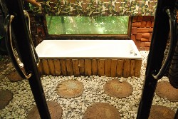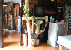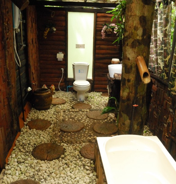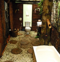 In addition to air-con, a DVD player, a computer, a private jungle-viewing terrace and a lovely bathroom whose floor is covered in sea-smoothed pebbles, it has 2 bedrooms, so ensuring parents night-time privacy.
