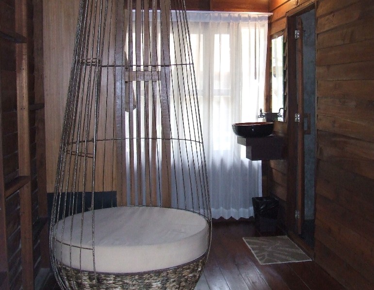 Huge terraces equipped with 2 bean bags front these large and attractive bungalow built almost entirely of wood.