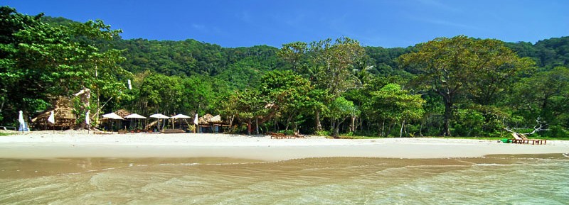 The setting is glorious. The southern half of Bamboo beach has no development at all on it, so if the visitor walks south from La Laanta resort, there is nothing but nature to be seen - monkeys playing in the trees or not so playfully baring their fangs, tropical trees swaying above a broad white swimmable beach, and a majestic backdrop of steep hills rising in a jungle amphitheatre behind the beach, and providing a dramatic and splendid frame for the soft sand on the beach.