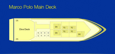 M/V Marco Polo is a large 25 meter x 7 meter wooden dive boat with two decks. The upper deck supports the captain's cabin and a large sun deck where people can relax and enjoy themselves. The lower deck has eight double cabins, each one with a double bed (lower) and a single bed (upper), with individual lights and windows. We have two toilets/showers with wash basins. There is a double entry/exit dive station at the stern, with two shower systems which make for easy access. Our 35 tanks are retained upright so that BCD and regulators can be fixed to them. Everything is ready for you to enjoy beautiful diving!
