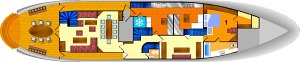 Tech SpecThe Pelagian was built at the Batservice Verft A/S Shipyard in Mandal, Norway, as a world-ranging luxury motor yacht. Her construction was to Lloyd's +100A1 yacht and +LMC classification, and she was stoutly built to travel the world's oceans in comfort and safety. Pelagian cruises at 9 knots and, with 42 metric tons of diesel fuel aboard, she has a range of over 8,000 nautical miles. Onboard water-makers and over 20 tons of fresh water in the tanks mean that we don't need to worry about having an extra shower or rinsing our cameras one more time! Measuring 35 meters (114 feet) overall in length, her beam is 7.5 meters (24 feet) and her draft is 3.4 meters (11 feet). At 245 tons, she has the size and heft to provide us with a secure base for our exploration of the aquatic world. Length: 35 metres / 115 foot