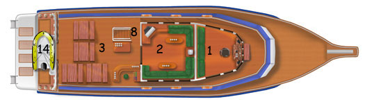 1 Wheelhouse - 2 Salon - 3 Dining area - 8 Stairs to main deck - 14 Dinghy storage