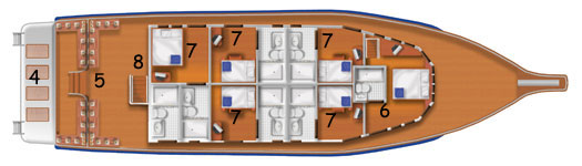 4 Dive platform - 5 Dive deck - 6 Master cabin - 7 VIP cabins - 8 Stairs to upper deck