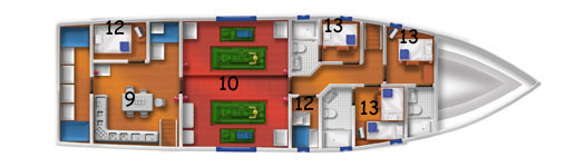 9 Galley and staff area - 10 Engine room - 12 Staff cabin - 13 Standard bunk cabin