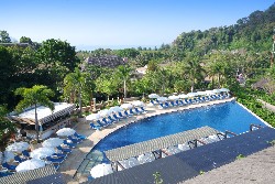 Shaded by jungle and almost totally hidden from view on a shady hillside, the Pakasai Resort blends harmoniously into grounds that have been lushly planted with tropical vegetation. Click here for a map. Giving the appearance of a resort within a jungle, it's very impressive, well shaded and has an abundance of birdlife and artificial streams and water features.