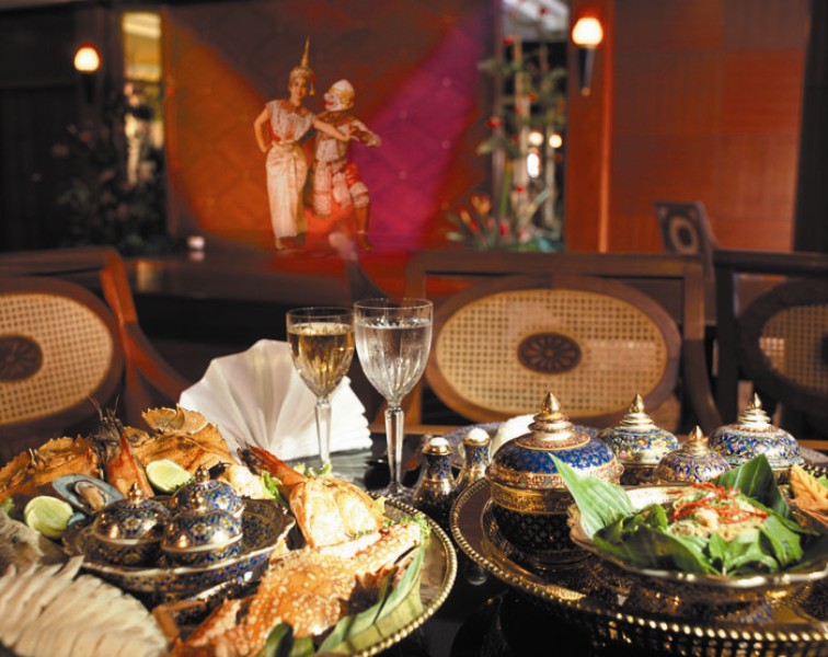 Built in a style inspired by palatial Thai architecture, the lobby is particularly elegant, centred around a Cambodian water goddess statue, who is herself surrounded by worshippers and water-lillies.