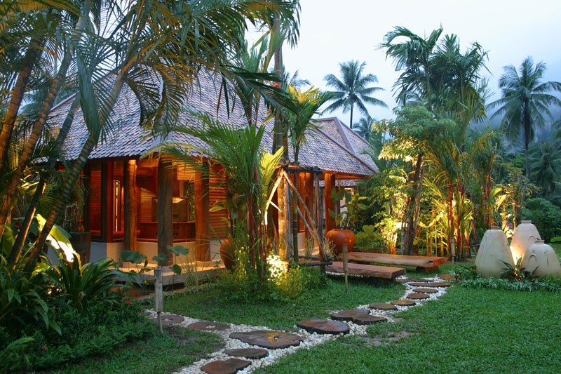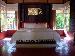 The single ‘Siwichai’ 80 sqm bungalow has a bathtub big enough for 4 people, is surrounded by a koi carp pond, and is very well appointed, with a day-sofa and a huge bed.